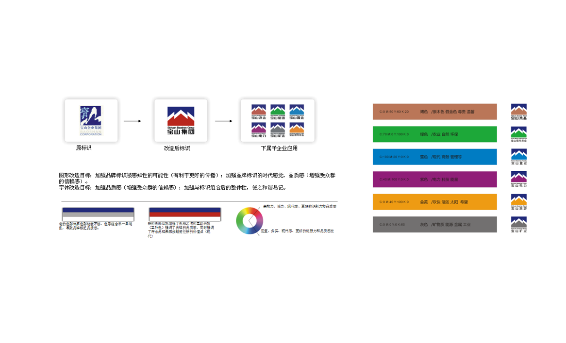 通过对宝山集团和各产业及26家公司实际情况的调研和分析,我们对宝山品牌形象做了详细的梳理与合理的规划,既做到了集团形象的传承与创新,又解决了集团旗下各产业公司形象的统一性和差异化之间的矛盾。依据分析,勤略提出了“领秀天府,中国宝山”的品牌核心理念,传承并创新性的设计了集团新的形象统一识别系统,又依据各产业的属性和特征,通过不同的标准色进行差异化区分,既保证了集团形象的统一,又满足了集团下各产业公司的差异化。