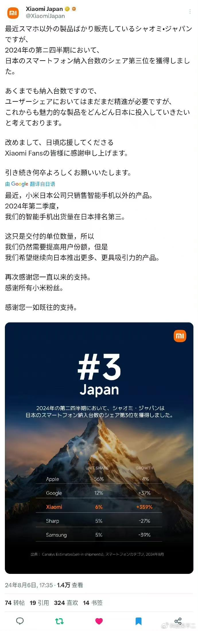 前段时间看见小米14 Ultra在日本发布,不支持卫星通信,电池降为5000mAh,售价九千多,相比国内版本高出2000+,但是依然卖得非常火爆。根据最新的消息,小米手机在日本,2024第二季度排名前三,仅次于苹果和Google,第四名和第五名分别为夏普和三星。这么一看,小米手机在日本的欢迎度都超过了本土品牌夏普的,可以说还是非常成功的。当然这里要说一下,增速,小米359%遥遥领先。