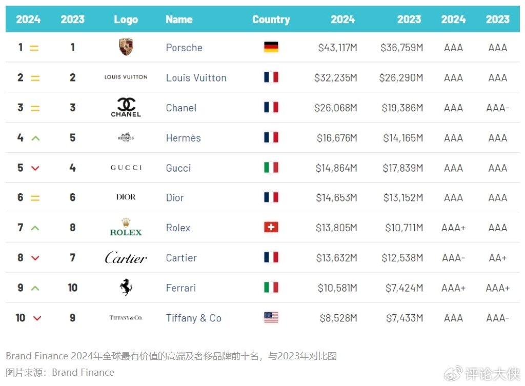 在奢侈品领域,品牌的价值不仅体现在其精湛的工艺、卓越的品质与独特的设计理念上,更在于其在全球消费者心中所树立的尊贵形象与深厚情感联结。不久前,品牌评估机构Brand Finance公布了“2024全球最具价值的高端及奢侈品牌50强”榜单,不仅揭示了奢侈品行业的最新趋势,同时也反映了消费者偏好和市场格局的变化。据悉,保时捷已经连续第七年位居榜首,路易威登第2,香奈儿排第3。