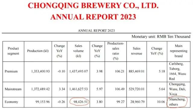 到2023年,“山城”啤酒及其他经济型啤酒合计年销量已降至10万吨以下,仅占重啤股份啤酒总销量的3%。