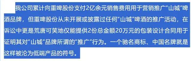 嘉威函告提出,曾累计向重啤股份支付2亿余元销售费用用于营销推广“山城”啤酒品牌,但重啤股份从未开展或披露过任何相关推广活动。