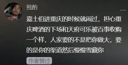 对此,就有网友评论,“山城啤酒销量下滑,不是因为没人买,而是买不到,山城啤酒销量囊个卖得起来”。甚至有懂行的网友表示,“嘉士伯进重庆的时候就闹过,担心重庆啤酒的下场和天府可乐被百世收购一个样。人家要的不是把你做大,要的是你的渠道然后慢慢雪藏你。”