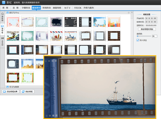 点击“叠加素材”-“加相框”,从影忆自带的海量精美相框素材中选择合适的相框,添加到视频中。相框不仅能装饰视频,还能有效遮挡水印。