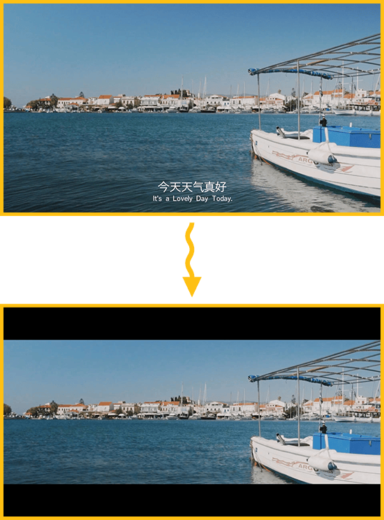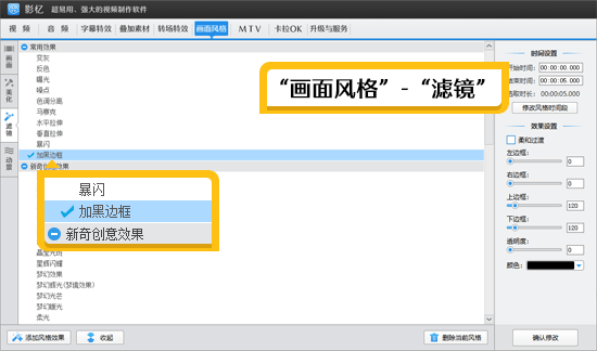 在顶部导航条“画面风格”,选择左侧“滤镜”,给视频应用“加黑边框”或选择其他颜色的边框。边框的大小、颜色等参数可以自由设置,以遮挡水印。