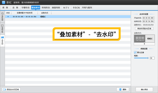 打开影忆软件,并导入需要处理的视频文件。在“叠加素材”面板中,点击“去水印”栏目。