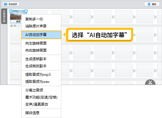 AI自动加字幕功能:影忆是一款简单易用、功能强大的视频编辑软件,其独特的AI自动加字幕功能让视频字幕的添加变得简单而高效。我们导入视频和音频后,右键要识别的文件,选择“AI自动加字幕”,选择语言,包括:普通话、粤语、英语、上海话以及几十种方言。