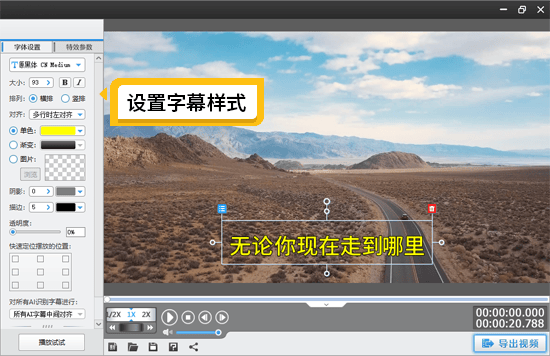 添加标题、片名片尾等字幕内容:软件还自带海量的字幕特效功能,支持给视频添加标题、片名、片尾等各种字幕内容。切换到“字幕特效”面板,定位到加字幕的时间点,双击视频预览框即可添加。