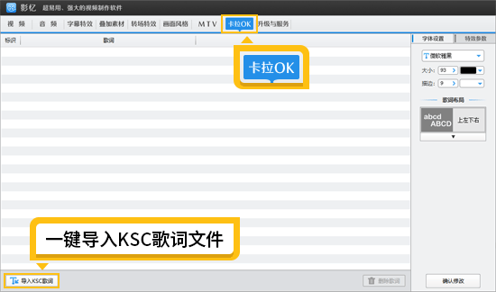 一键制作动感歌词字幕:软件支持一键导入歌词文件,给视频添加酷炫歌词字幕。切换到“卡拉OK”面板,可以一键导入KSC歌词文件,制作卡拉OK歌词效果,也可以制作网上很火的跳动歌词效果。