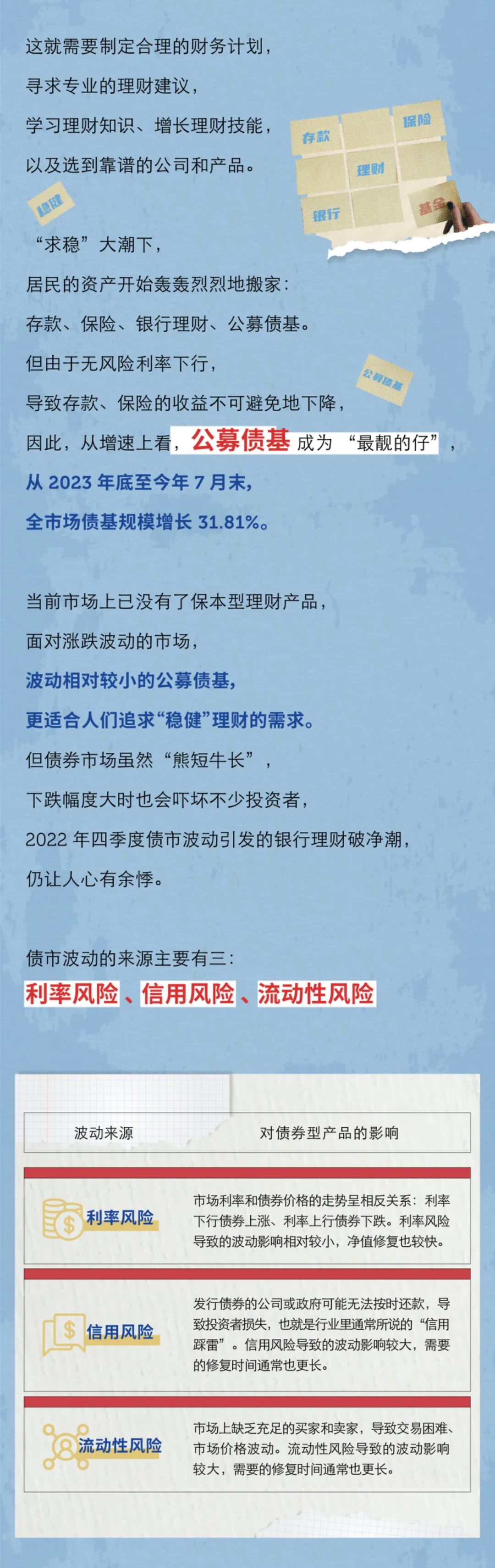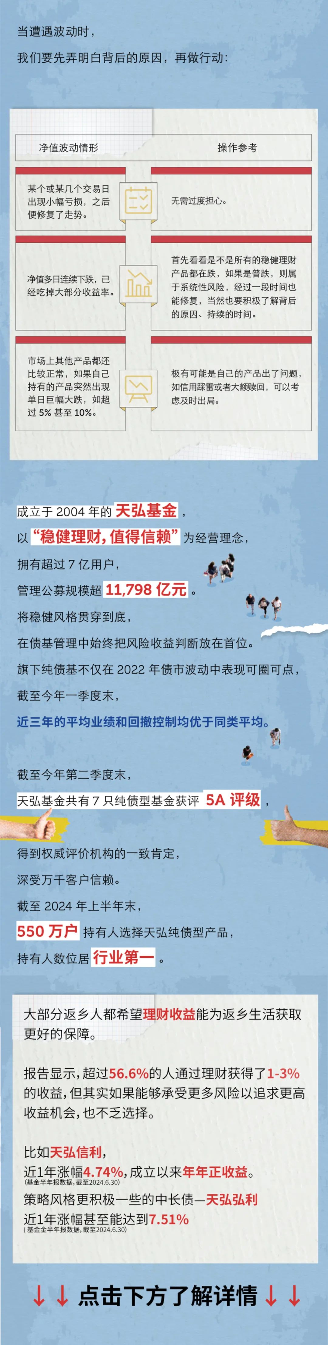 数据来源:全市场债基规模增长数据来源证券基金业协会。天弘基金持有人数据来源于2024年基金半年报,纯债型产品行业排名数据来源于2024年基金半年报及Wind分类下的短期纯债型基金、中长期纯债型基金、被动指数型债券基金。公募规模数据来源2024年基金二季报。天弘基金旗下纯债产品近3年表现来源上海证券基金评价研究中心,时间截至2024年一季度末,数据选取成立满3年的主代码基金产品,且二级分类为短期纯债型基金与中长期纯债型基金为对比标的,统计不同分类下的产品的平均业绩与同类均值:近三年天弘基金旗下中长期纯债型基金收益率为11.49%,同类平均为10.95%;天弘旗下短期纯债型基金收益率为8.75%,同类平均为8.74%;近三年天弘旗下中长期纯债型基金最大回撤为-1.12%,同类平均为-1.29%;天弘旗下短期纯债型基金最大回撤为-0.31%,同类平均为-0.76%。天弘弘利债券A、天弘信利A、天弘季季兴A、天弘安益C、天弘优选A、天弘同利C、天弘中债3-5年政金债指数获得了晨星中国、银河证券、招商证券、天相投顾最新一期的三年/五年最高评级;基金产品评级,晨星(2024.7.4发布)、天相投顾(2024.7.5发布)、招商证券(2024.7.12发布)、银河证券(2024.7.6发布),评级数据均截至2024年6月30日;海通证券评级数据截至2024年4月26日,2024年5月1日发布。天弘信利债券型证券投资基金-A类成立于2016年12月16日,成立以来所有完整会计年度产品业绩及比较基准业绩为2017年1.93%(0.28%)、2018年6.33%(8.12%)、2019年4.13%(4.67%)、2020年3.18%(2.97%)、2021年4.68%(5.23%)、2022年2.89%(3.32%)、2023年4.87%(4.81%)业绩数据来源于基金定期报告。基金过往业绩不代表未来表现,本基金根据侧袋机制指引及相关配套规则的要求,于2021年调整过基金投资策略,具体请阅公司官网披露的基金合同、招募说明书等法律文件。天弘弘利债券型证券投资基金-A类成立于2013年09月11日,成立以来近5个完整会计年度产品业绩及比较基准业绩为2019年3.67%(3.43%)、2020年2.23%(3.33%)、2021年3.89%(3.21%)、2022年2.68%(3.11%)、2023年3.71%(3.02%)业绩数据来源于基金定期报告。基金过往业绩不代表未来表现,本基金根据侧袋机制指引及相关配套规则的要求,于2021年调整过基金投资策略,具体请阅公司官网披露的基金合同、招募说明书等法律文件。风险提示:观点仅供参考,不代表投资建议。市场有风险,投资需谨慎。历史业绩不代表未来表现。