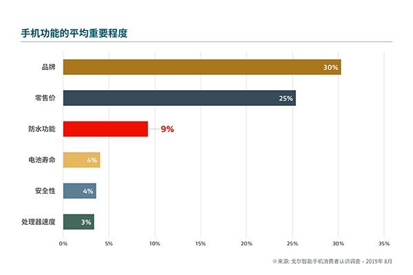 戈尔调查发现,在智能手机的14个属性中,品牌和价格的平均重要程度分别为30%和25%,对消费者购买决策的影响力最大。防水功能以9%的占比紧随其后,在除品牌和价格的其他属性中对购买决策的影响力最大。电池寿命以4%的占比位居第四,但它的影响力不及防水功能的一半。