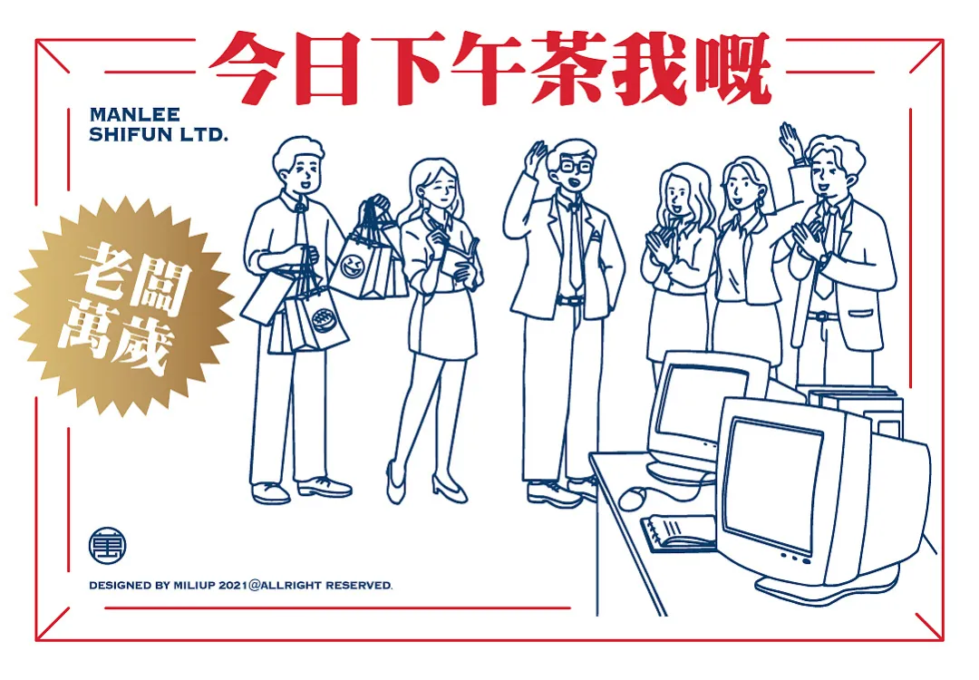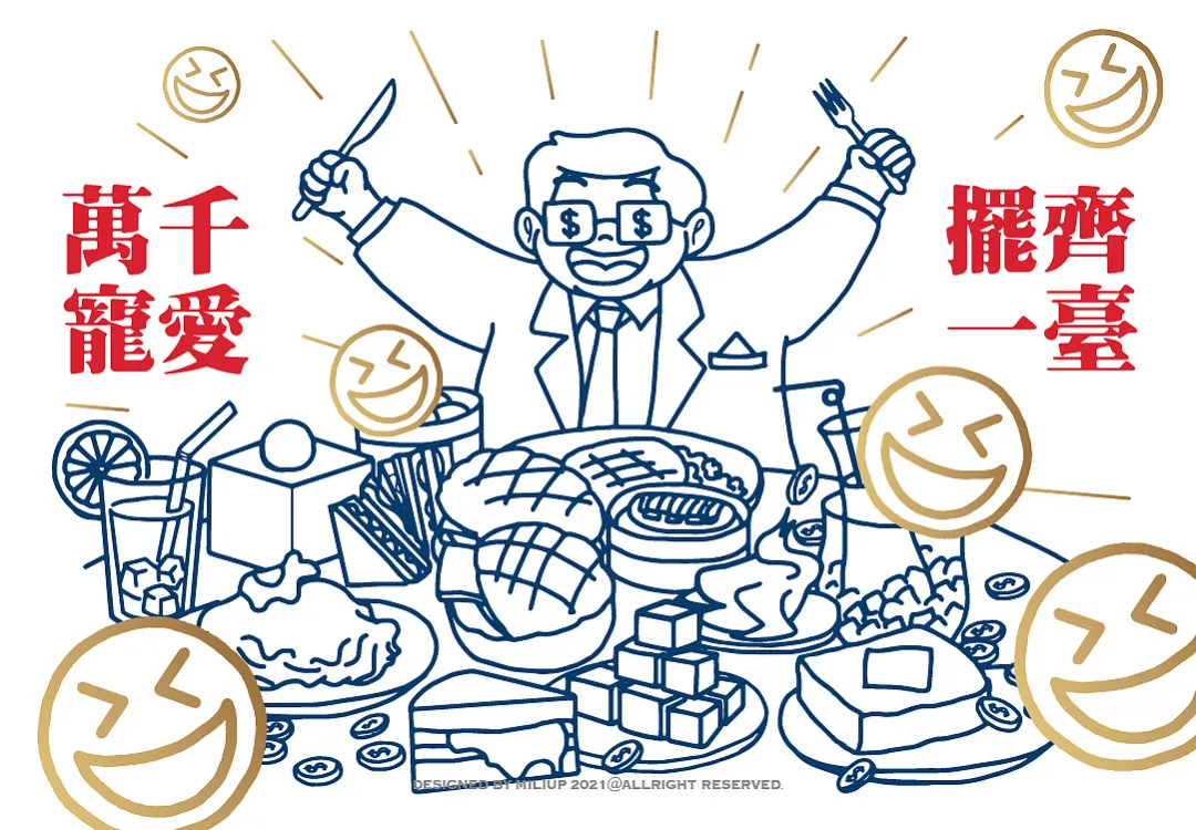在颜色的使用上,港式红占据主导,辅之以藏蓝、渐变金和白色,构建一幅幅趣味、个性的场景插画和产品插画。